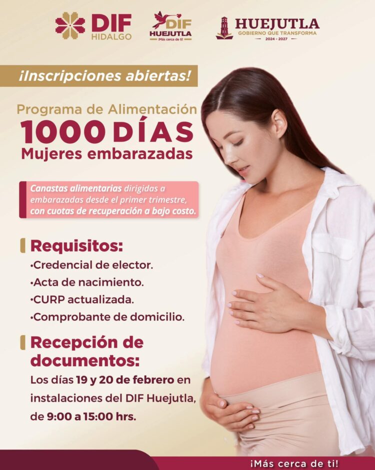 Huejutla ATENCIÓN MUJERES EMBARAZADAS: DIF HUEJUTLA INVITA A PARTICIPAR EN EL PROGRAMA ALIMENTARIO “1000 DÍAS” 19 febrero, 2026