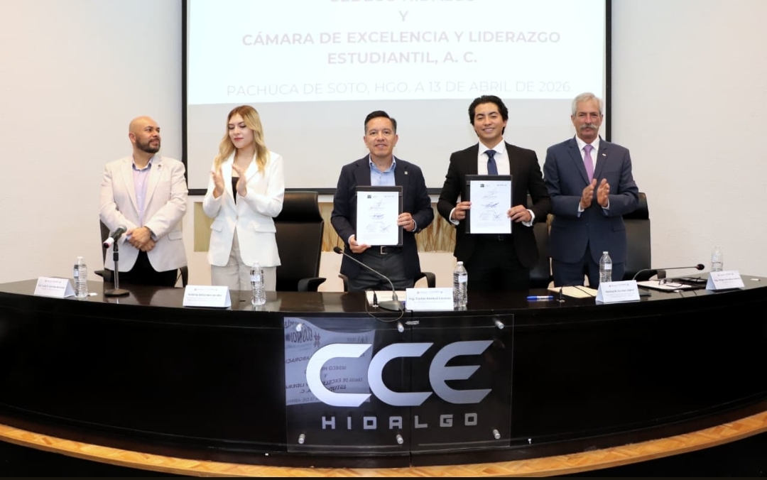 Pachuca de Soto, Hidalgo.- Bajo la firme convicción del gobernador Julio Menchaca Salazar de convertir el talento joven en el eje transformador de la entidad, la Secretaría de Desarrollo Económico (Sedeco) formalizó una alianza estratégica con la Cámara de Excelencia y Liderazgo Estudiantil, A.C. (CELEH).